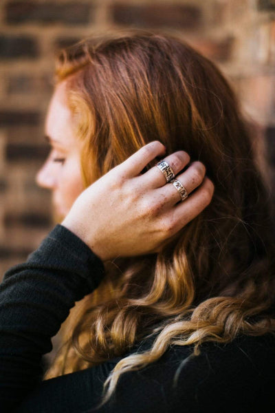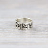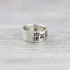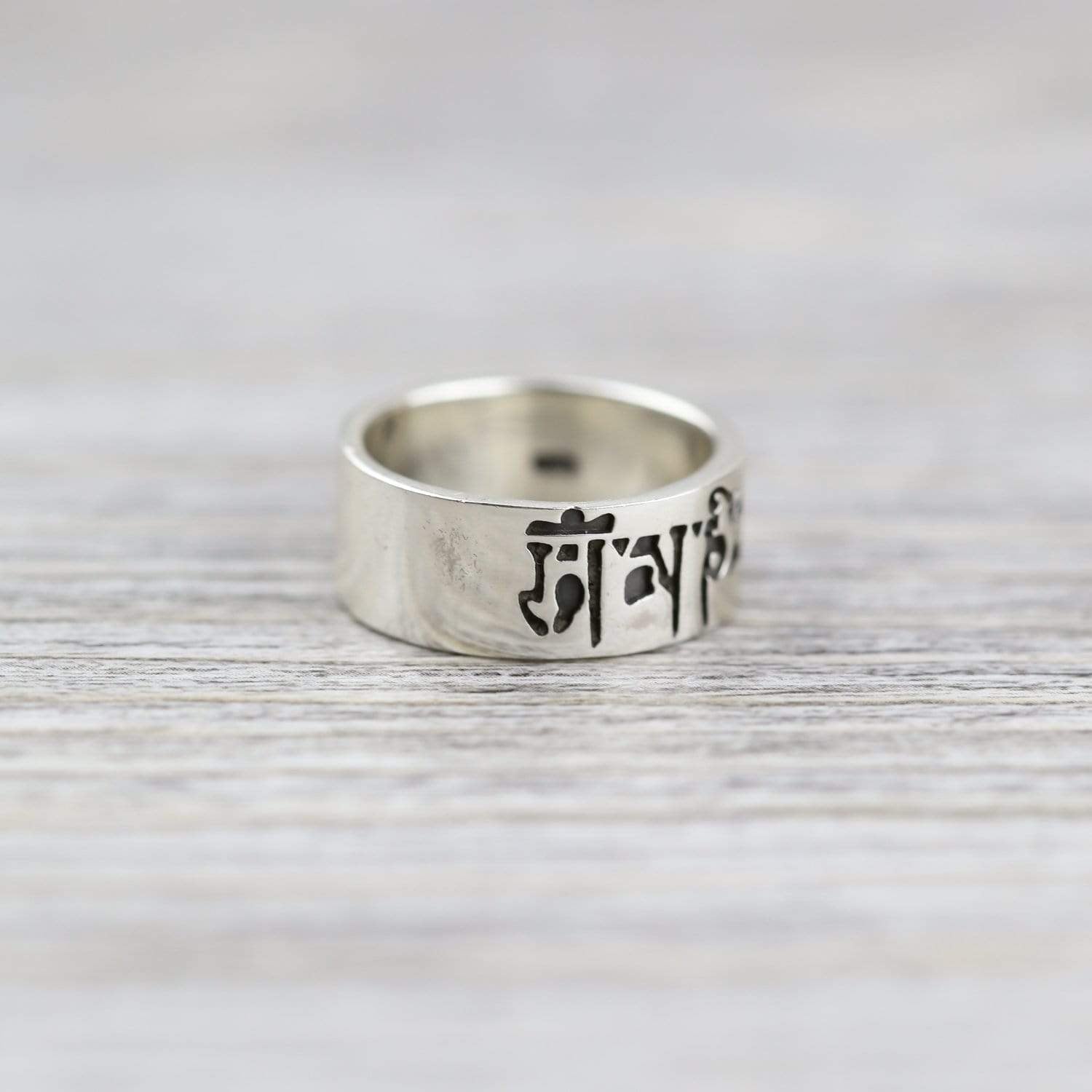 • Este anillo está hecho a mano por un grupo de plateros de comercio justo en Nepal y presenta el mantra de compasión, "Om Mani Padme Hum", en escritura tibetana.