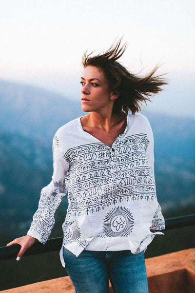 Nuestro equipo eligió por primera vez nuestra exclusiva camiseta de manga larga Om en Katmandú en marzo de 2015. El terremoto se produjo poco después y fue necesario realizar muchas reparaciones en el almacén donde se guardaban todos nuestros materiales. Toda la ropa fue impresa a mano y luego entregada a las mujeres de la aldea local para que la cosieran en sus propios hogares.