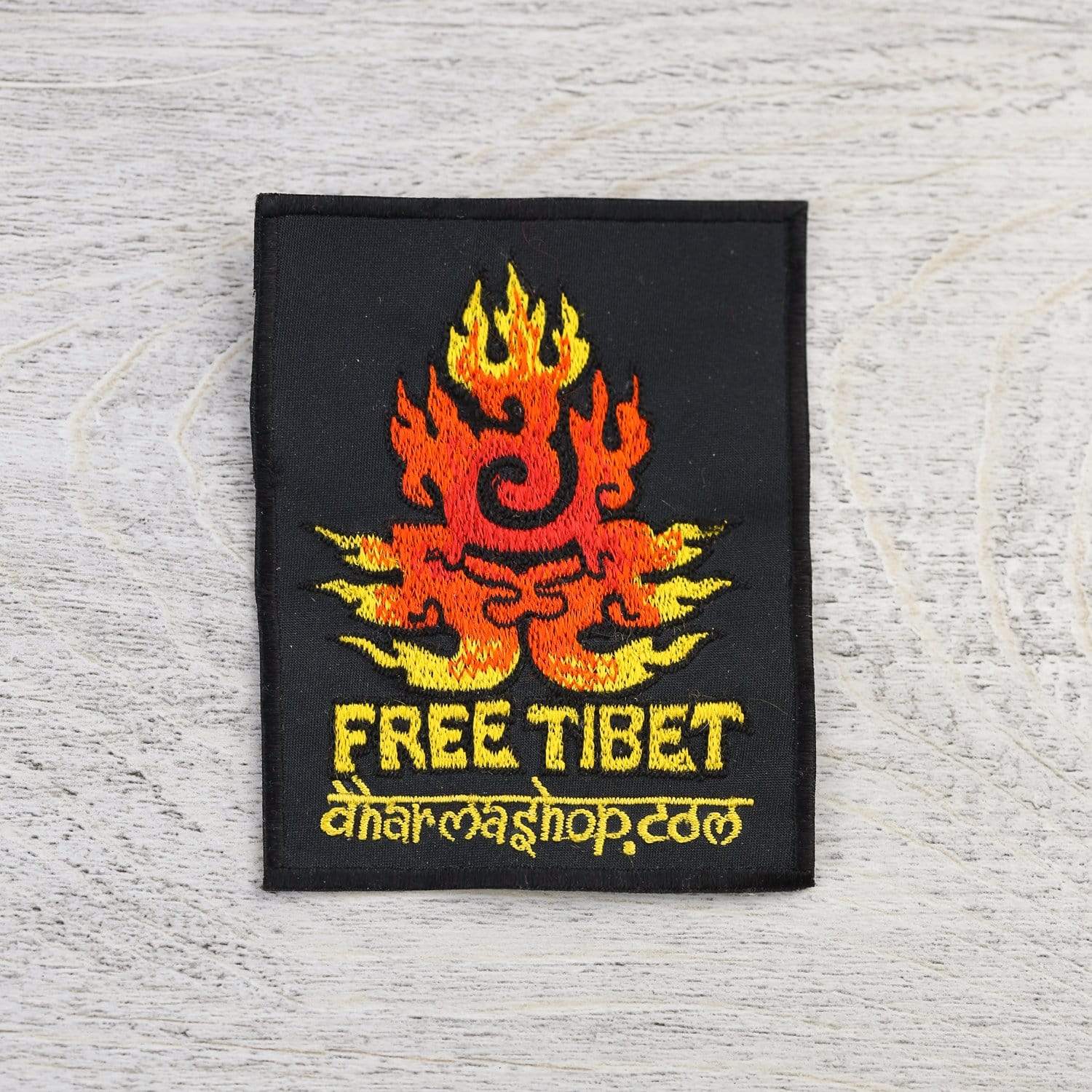 Presenta un diseño llameante de Free Tibet con nuestro nombre debajo.