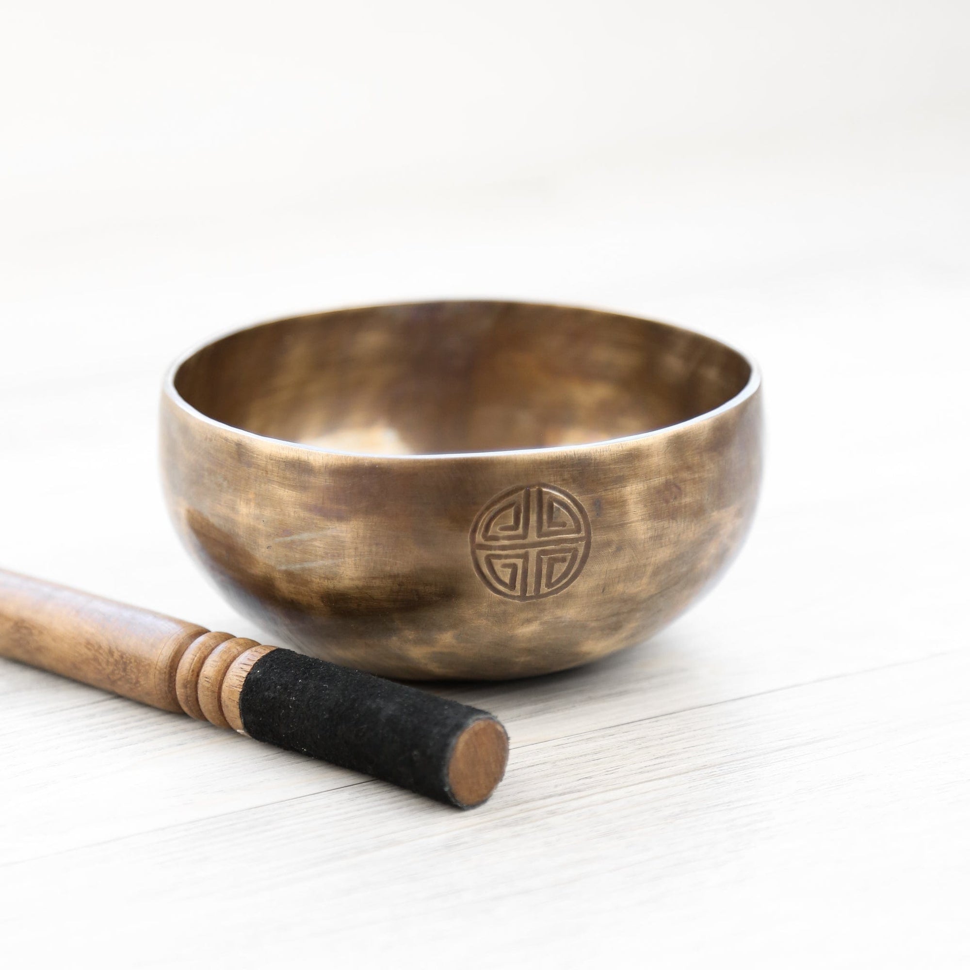 Each bowl features gorgeous hand carved details including an exclusive Full Moon Singing Bowl stamp and the mantra of compassion in Tibetan script. The mantra invokes the powerful benevolent attention and blessings of Chenrezig, the embodiment of compassion. The Full Moon Singing Bowl stamp is also known as a symbol of longevity and happiness.