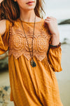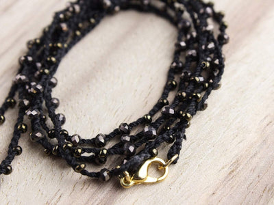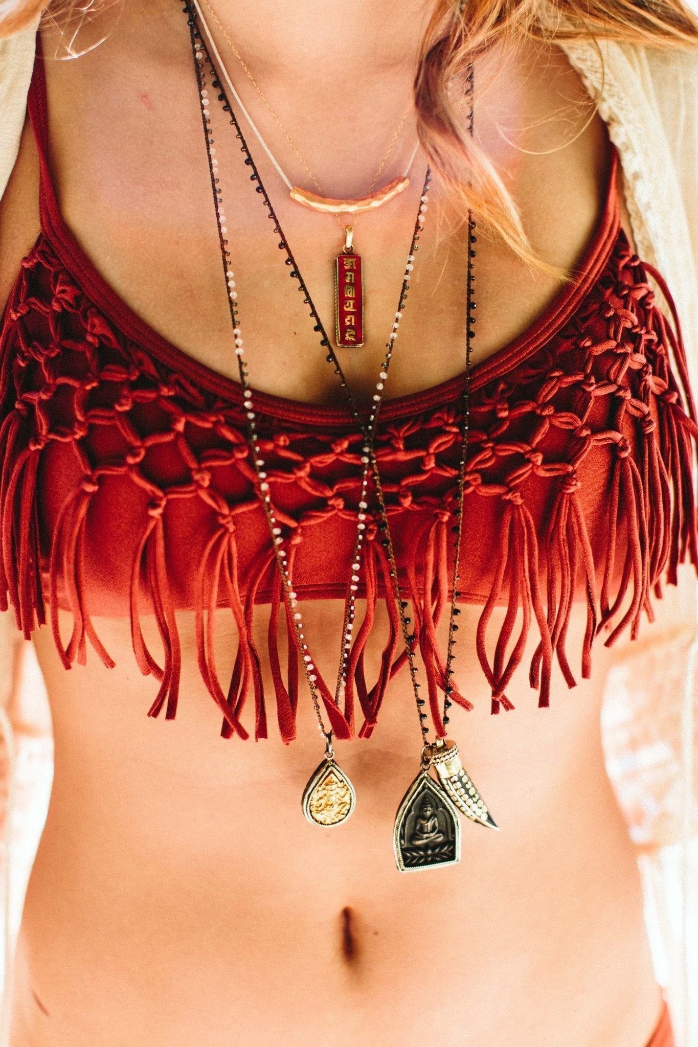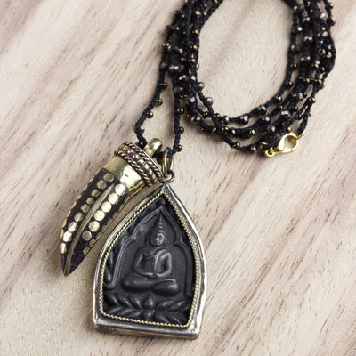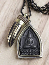 El colgante de cuerno de latón de tamaño mediano se encuentra junto a un amuleto tailandés con el sello de Buda en un hermoso cordón tejido negro. El amuleto tailandés está hecho de arcilla, prensada a mano por monjes tibetanos y luego colocada en su marco de metal. El collar presenta un cierre de broche y hermosas piedras preciosas facetadas.