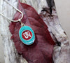 Este colgante ovalado tibetano Om es de metal blanco con incrustaciones de coral y turquesa.
