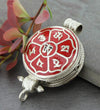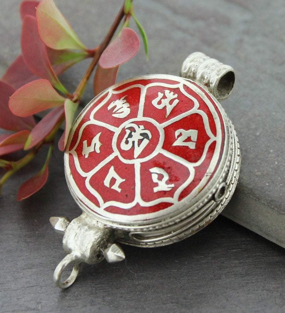 Uno de mis favoritos de mi reciente viaje de compras a Nepal. Este gran gau tiene incrustaciones de coral y plata om mani padme colgado.