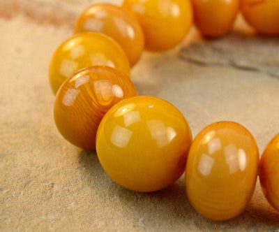 Una pulsera de cuentas de color ámbar brillante. Cuentas de ámbar sintético que quedan muy bien combinadas con otras pulseras y malas de muñeca. Las cuentas están hechas de resina.