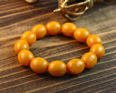 Una pulsera de cuentas de color ámbar brillante. Cuentas de ámbar sintético que quedan muy bien combinadas con otras pulseras y malas de muñeca. Las cuentas están hechas de resina de árbol natural, lo que crea una alternativa hermosa y asequible al ámbar báltico.