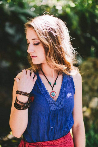 Este collar clásico y tradicional está hecho con cordón negro anudado a mano con piedras de coral y turquesa más oscuras. Presenta una rueda del Dharma con coral, turquesa y lapislázuli engastados en un colgante plateado. 100% fabricado en Nepal.