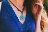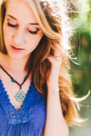 Collar clásico y tradicional de la Rueda del Dharma colgado de un cordón negro anudado a mano. Presenta piedras decorativas de color turquesa oscuro y una Rueda del Dharma plateada con coral, turquesa y lapislázuli.