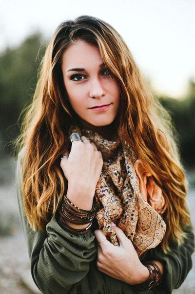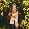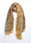 Esta ligera bufanda semitransparente color melocotón antiguo está salpicada de un sutil estampado floral en negro y azul, mientras que las rayas plateadas tipo oropel añaden brillo.