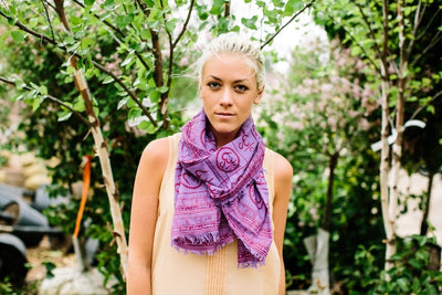 Nuestro nuevo pañuelo diseño Om morado es 100% algodón. ¡Una bufanda ligera perfecta para la primavera y el otoño!