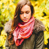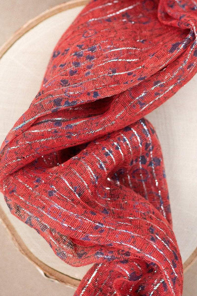 Esta ligera bufanda semitransparente de color rojo está salpicada de un sutil estampado floral en negro y azul, mientras que las rayas plateadas tipo oropel añaden brillo.