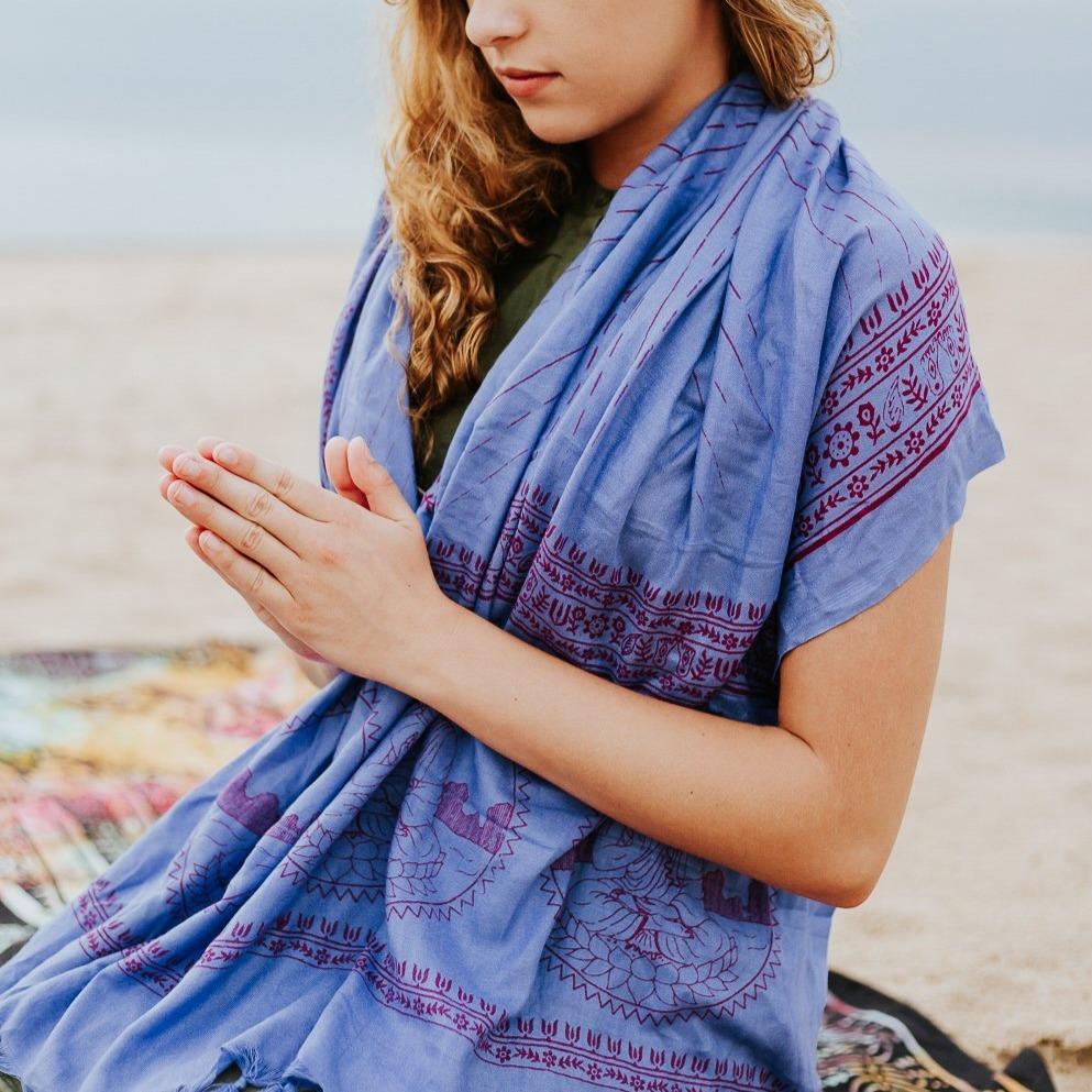 Estos hermosos chales de oración son lo suficientemente grandes para una meditación sentada y tranquila. Están impresos a mano a partir de bloques de madera tallados a mano y presentan diseños tradicionales con una gran imagen central de Buda. Confeccionado en muselina de algodón ligero en un color bígaro azul intenso con bordes deshilachados atados en borlas.