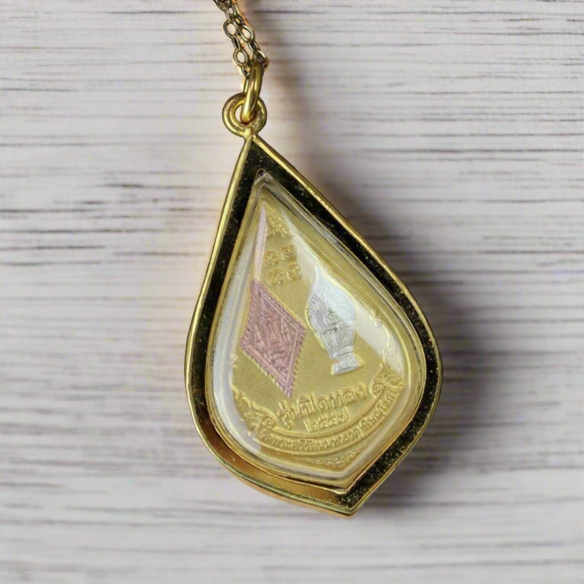 El frente del amuleto presenta un Buda meditando, mientras que el reverso incluye varias oraciones en tailandés. Los amuletos tailandeses no deben sumergirse en agua; quítelos antes de bañarse o nadar.
