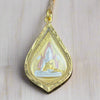 Este amuleto de Buda dorado de Tailandia tiene dos caras y está rodeado de pan de oro y plata.