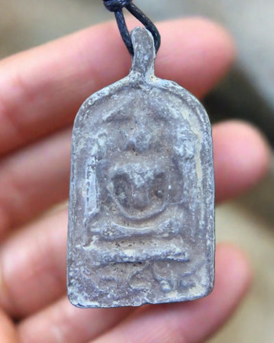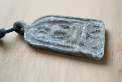 Encuentro toneladas de amuletos increíbles en Bangkok, Tailandia. Parece que cada residente de Tailandia lleva al menos un collar de Buda. Varían en forma, tamaño y alcance. Este sencillo Buda de metal oxidado es muy singular y rústico.