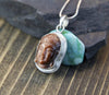 La elegante cabeza de Buda fundida en piedra dorada con serena expresión meditativa está engarzada en plata de ley con fianza de primera ley. Una cuerda tallada a mano decora los lados del entorno. Hecho a mano en Nepal.