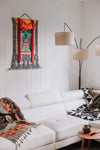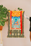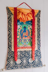 El tradicional tejido de brocado tibetano es una mezcla de poliéster y seda, lo que lo convierte en un material duradero y versátil. Presenta diseños de loto dorado sobre azul real con marcos rojos y amarillos alrededor de la pintura.