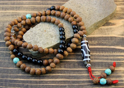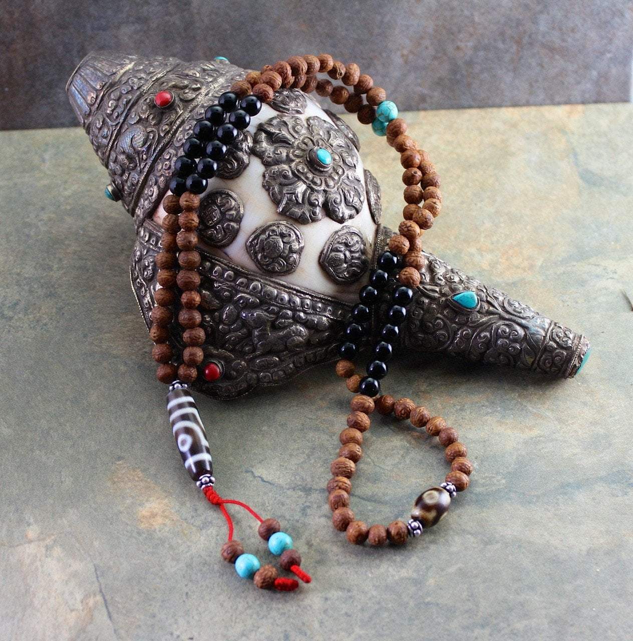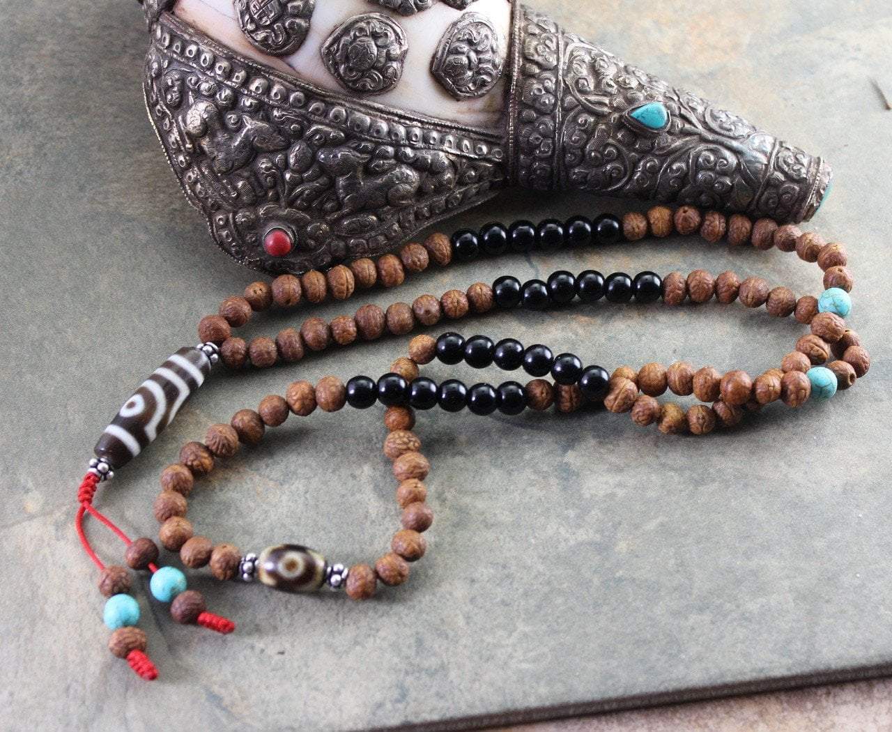 Uno de nuestros clásicos collares de semillas de raktu y cuentas de 3 Eye Dzi. Cuenta con una cuenta Dzi de ágata verdadera de 3 ojos, una cuenta Dzi de ágata de 2 ojos y está acentuada con cuentas de ónix y turquesa. Encordado con cordón rojo.