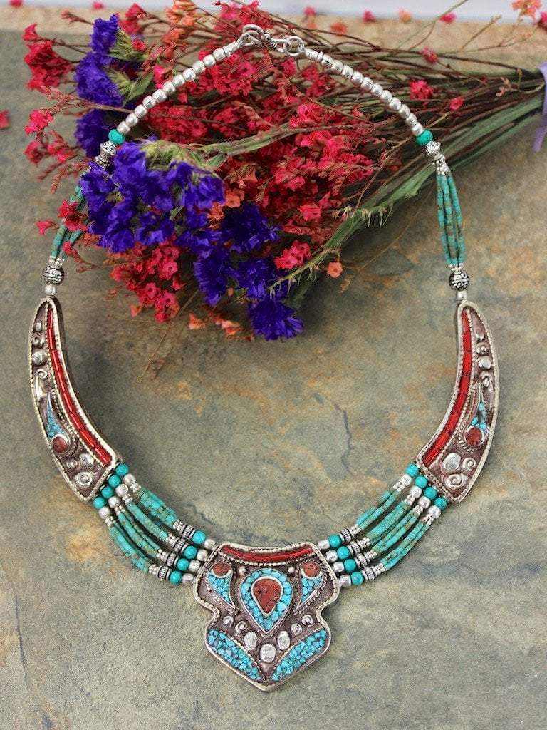 Un diseño único y sorprendente con cuentas tibetanas con incrustaciones de coral y turquesa. en una especie