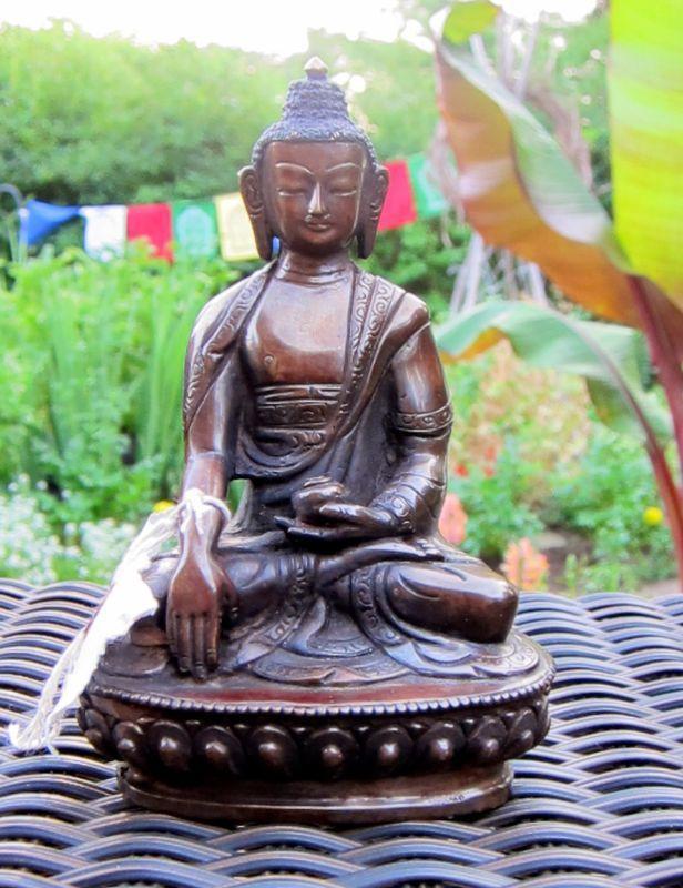 La familia Shakya en Katmandú, Nepal, ha estado fabricando estatuas budistas durante 3 generaciones. Los detalles de esta estatua son realmente maravillosos. El pelo está pintado de azul y el acabado restante es de bronce pulido.
