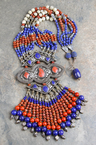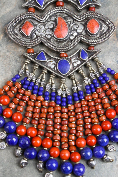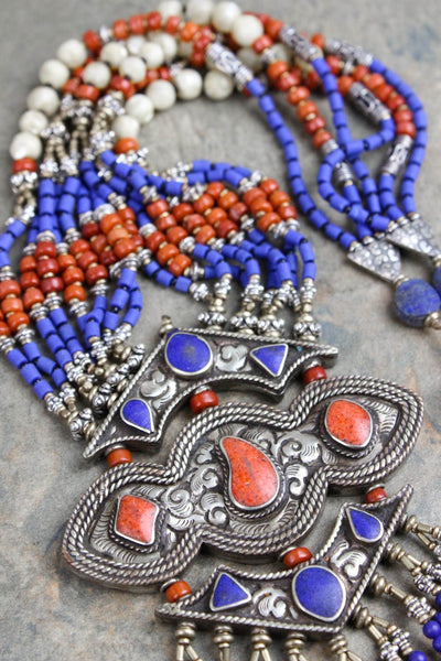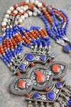 Este collar incluye no sólo cuentas de lapislázuli y coral, sino también seis juegos de perlas que se consideran uno de los símbolos sagrados de la buena suerte. Además, se incorpora un atrevido colgante de plata con incrustaciones a mano que contiene lapislázuli y piedras de coral de varias formas. Debido a que cada pieza está hecha a mano, la forma o el color de la piedra pueden variar ligeramente.