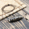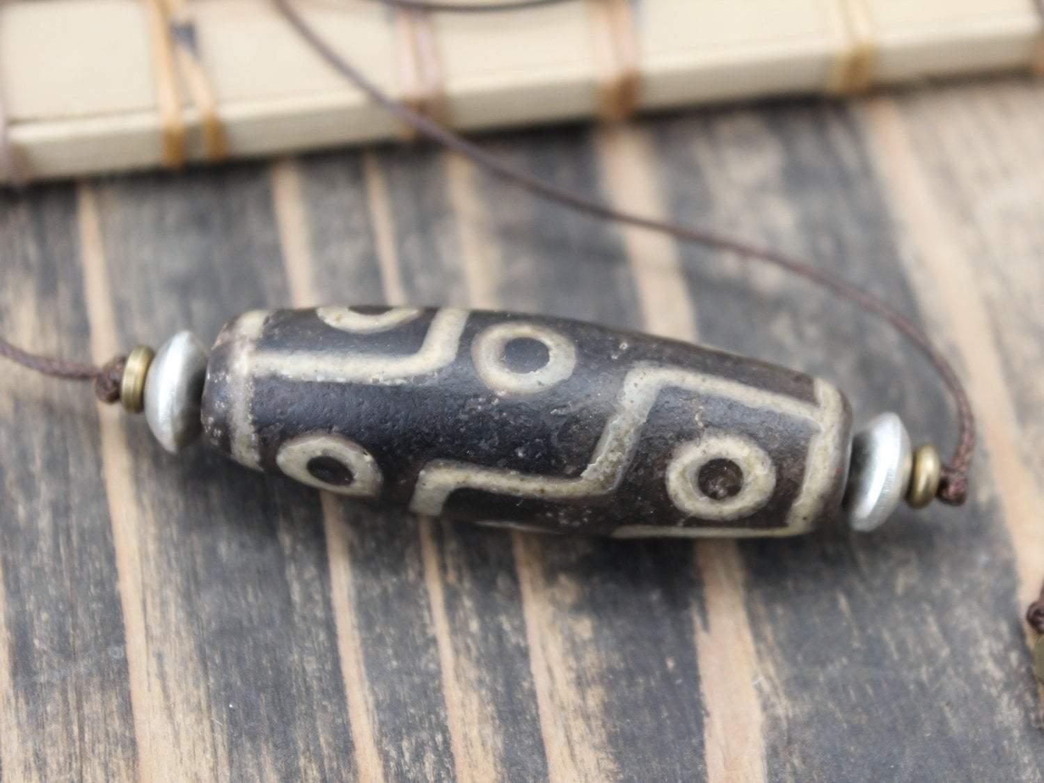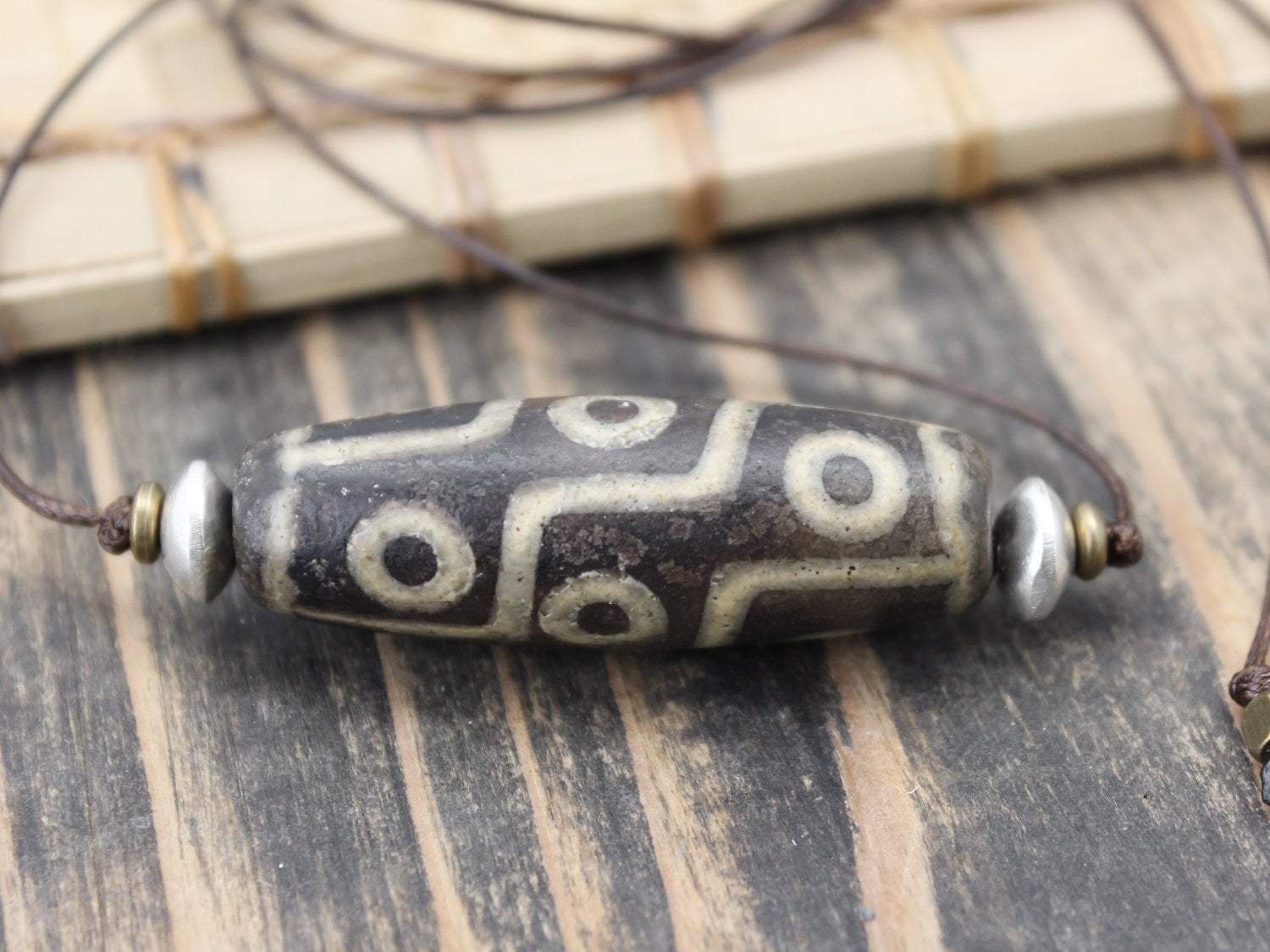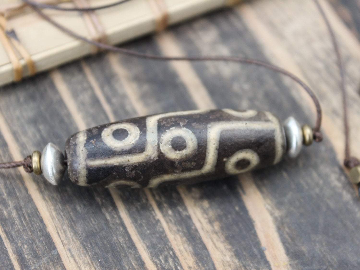 Cada uno de nuestros collares de cuentas Dzi está ensartado a mano aquí en DharmaShop con cuentas recolectadas en los últimos 17 años en Katmandú, Nepal. Este collar presenta un Dzi de nueve ojos con detalles en latón y plata sobre un cordón de cuero vegano marrón. Un nudo corredizo permite ajustar fácilmente la longitud del collar.