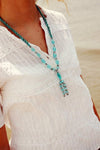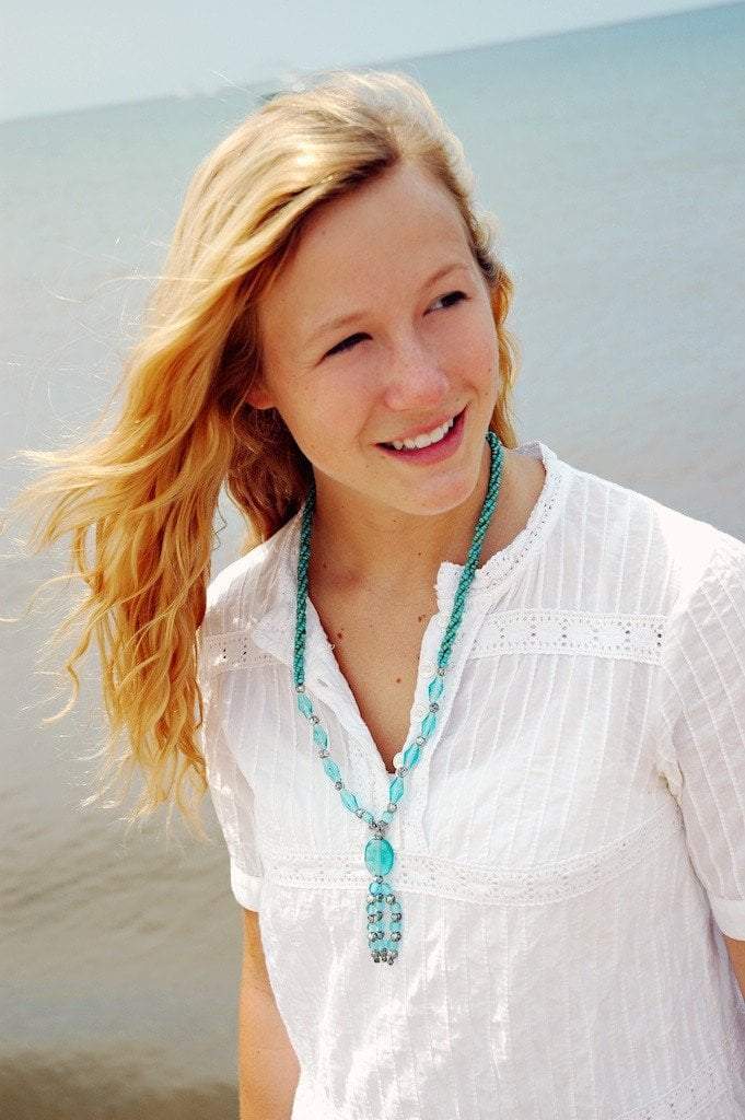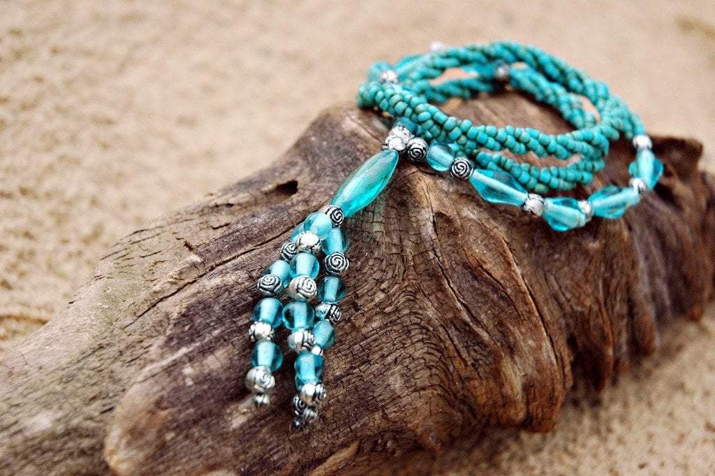 Como novedad en Indonesia, estamos trabajando con un grupo de artesanos que fabrica estos increíbles y asequibles collares con material de resina reciclado de botellas de refrescos y bolsas de plástico. Este collar presenta hebras coloridas de cuentas acrílicas de color azul claro con espaciadores de flores.