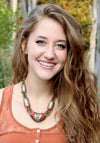 Mide aproximadamente 18 pulgadas alrededor. La cuenta focal mide 1 1/4 pulgadas de alto y 2 1/2 pulgadas de ancho.