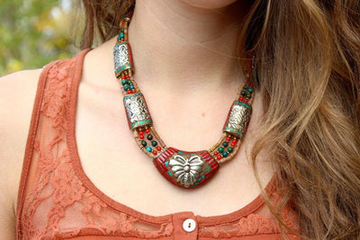 ¡Este clásico collar tibetano te dejará boquiabierto! Está hecho a mano con auténticos corales antiguos, turquesas y cuentas de latón y plata para crear una obra maestra tibetana atrevida pero muy ponible.