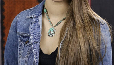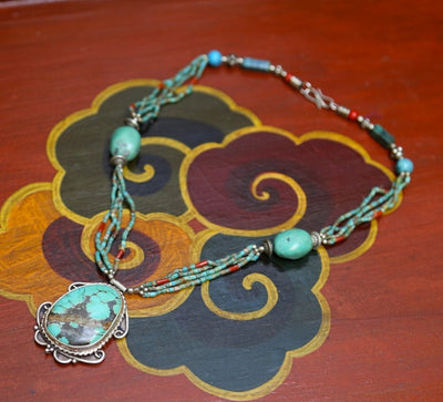 Un extraordinario collar tibetano con una gran cuenta de turquesa recogida a mano en Nepal e incrustada de oro y plata y engastada en plata de primera ley.