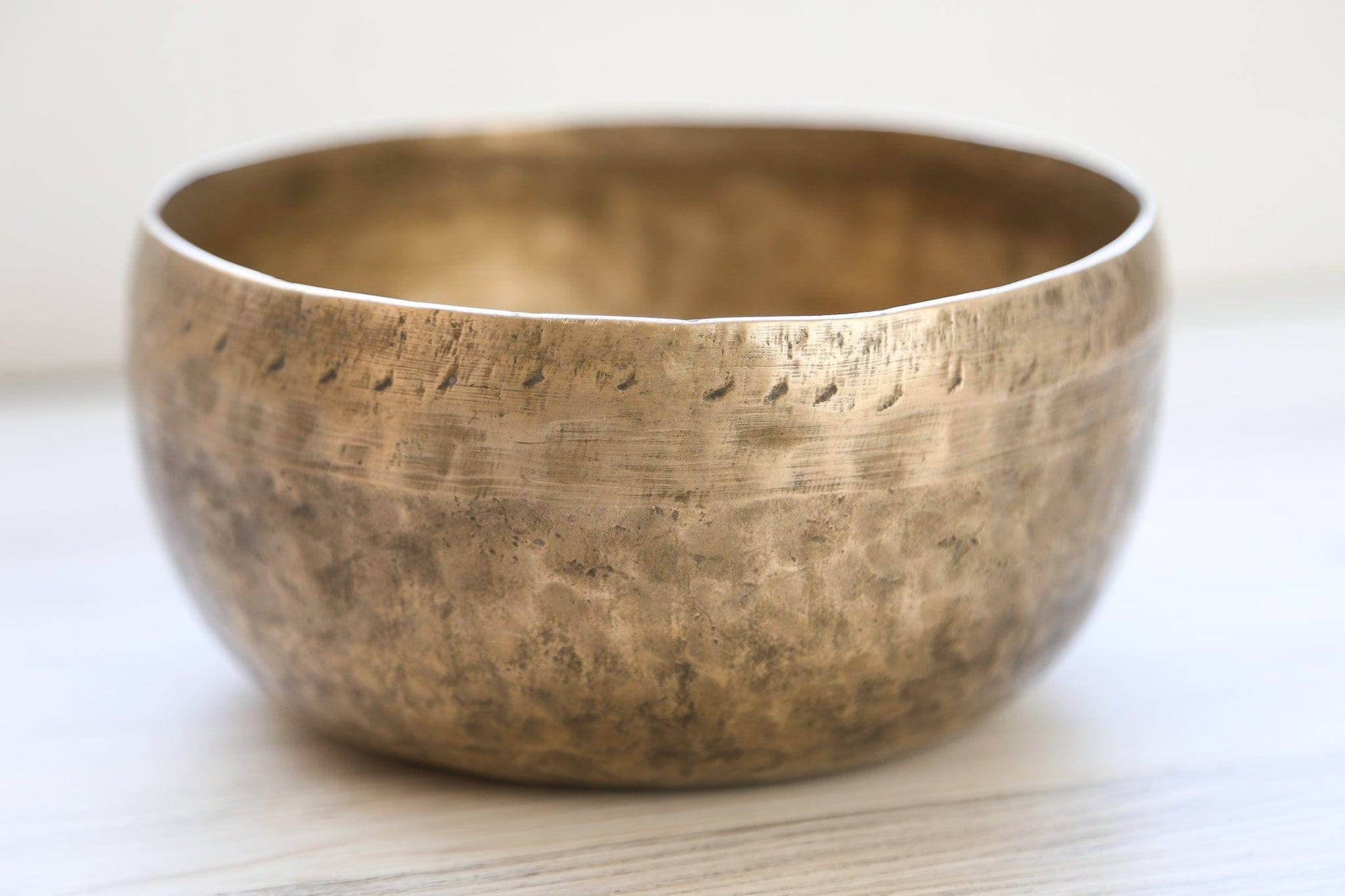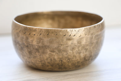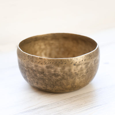 Each time we're able to get a small collection of these bowls is exciting as they are exceptional. Antique Tibetan singing bowls are highly sought after for their remarkable quality of sound, rich tones, and unique physical characteristics. Every handmade mark tells a story of the bowls history! In your hands, we know that these bowls will continue to be a lifetime heirloom, telling their story through their unique markings and golden tones.