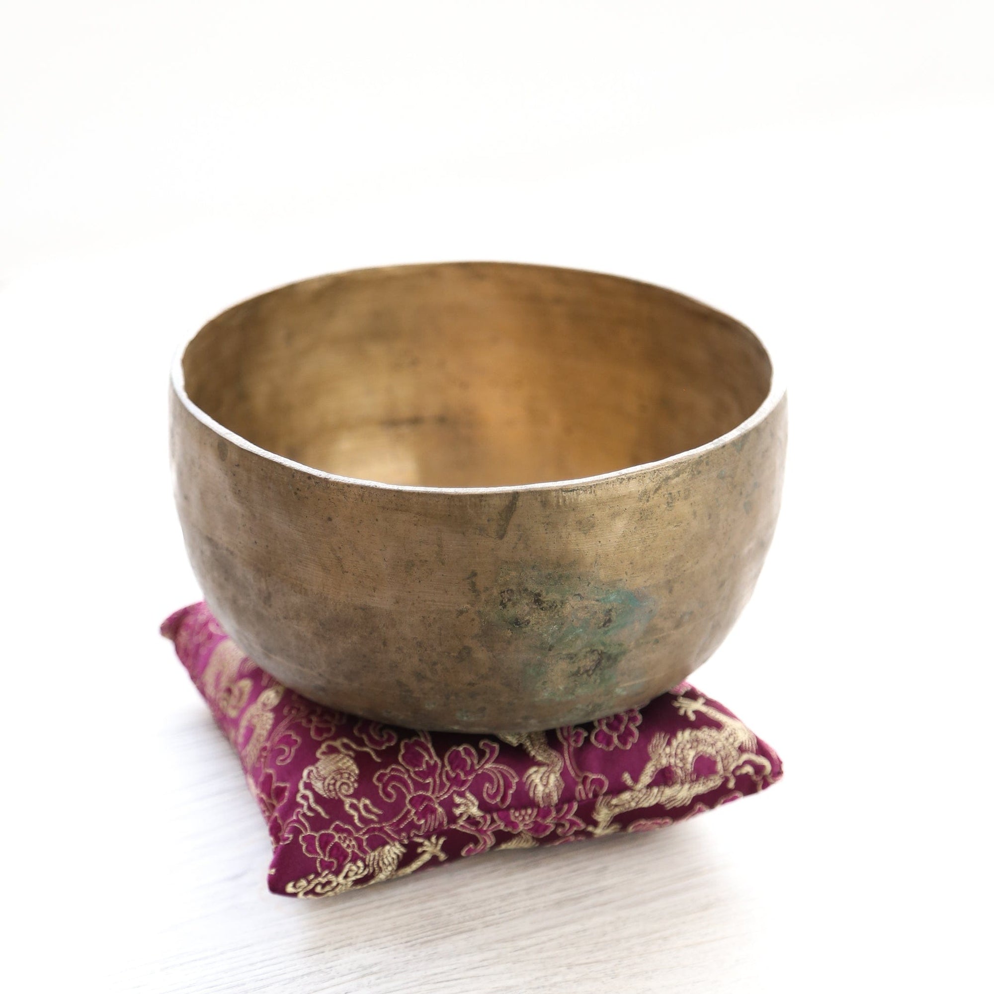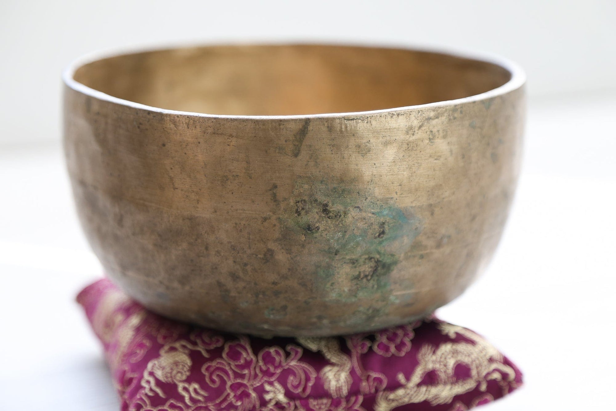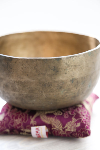 Each time we're able to get a small collection of these bowls is exciting as they are exceptional. Antique Tibetan singing bowls are highly sought after for their remarkable quality of sound, rich tones, and unique physical characteristics. Every handmade mark tells a story of the bowls history! In your hands, we know that these bowls will continue to be a lifetime heirloom, telling their story through their unique markings and golden tones.
