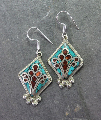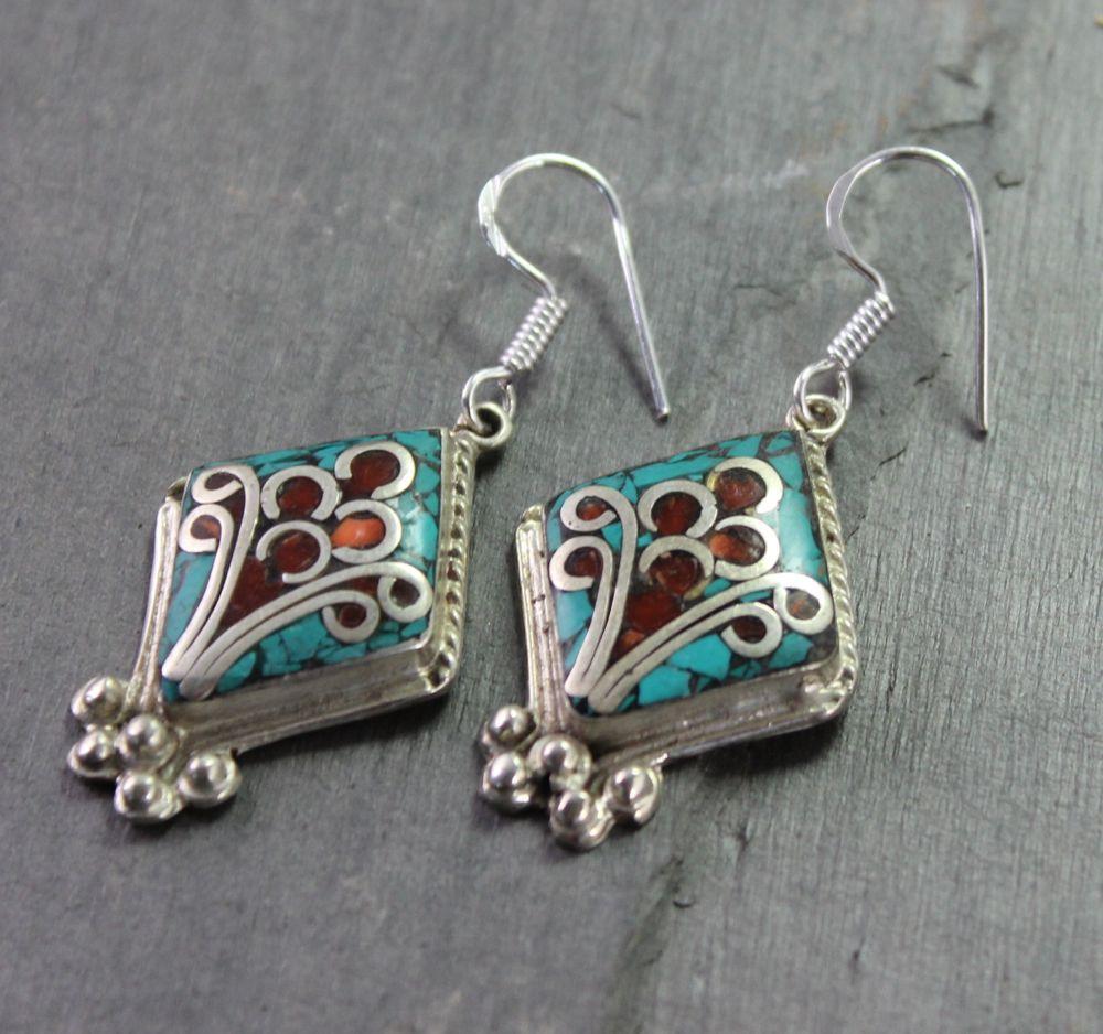Hermosas incrustaciones de turquesa y copal en latón bañado en plata. Hecho a mano en Katmandú, Nepal.