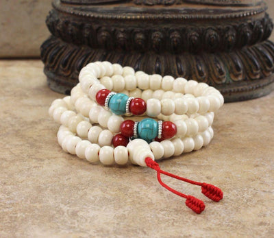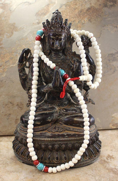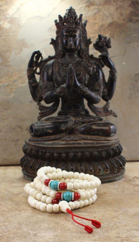 108 cuentas de hueso de yak con 3 cuentas de turquesa prensada y 6 de coral sherpa. Mide aproximadamente 30 pulgadas alrededor. Las cuentas miden aproximadamente 8 mm, las cuentas de turquesa prensadas miden 10 mm.