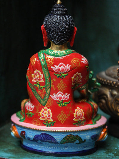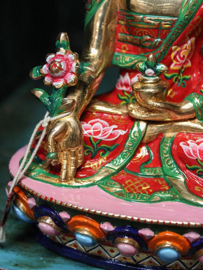 Esta exquisita estatua del Buda de la Medicina está hecha a mano en Katmandú, Nepal, por una familia de artesanos de quinta generación. Cada estatua de bronce se fabrica utilizando el método de cera perdida, lo que requiere mucho tiempo y habilidad. Después de la fundición, cada estatua es detallada y tallada a mano por maestros artesanos.