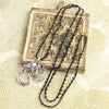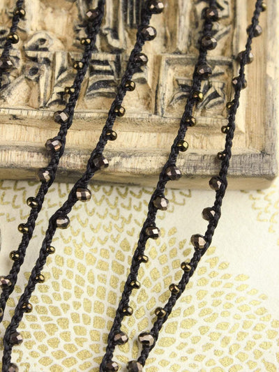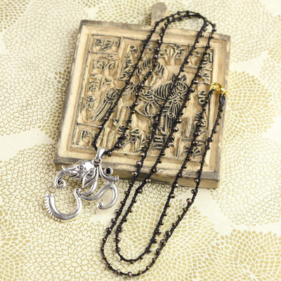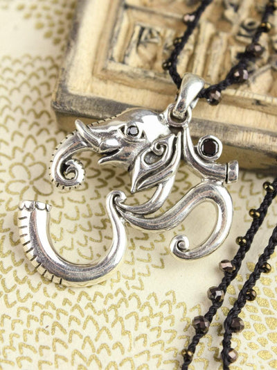 Este nuevo y exclusivo collar muestra uno de nuestros pedantes de plata esterlina favoritos que presenta un Om con diseño de elefante y dos pequeñas piedras preciosas de ónix. El colgante está colgado de un cordón tejido negro que incluye un cierre de broche y está anudado a mano con preciosas piedras preciosas facetadas. Cantidad limitada: ¡solo 4 disponibles!