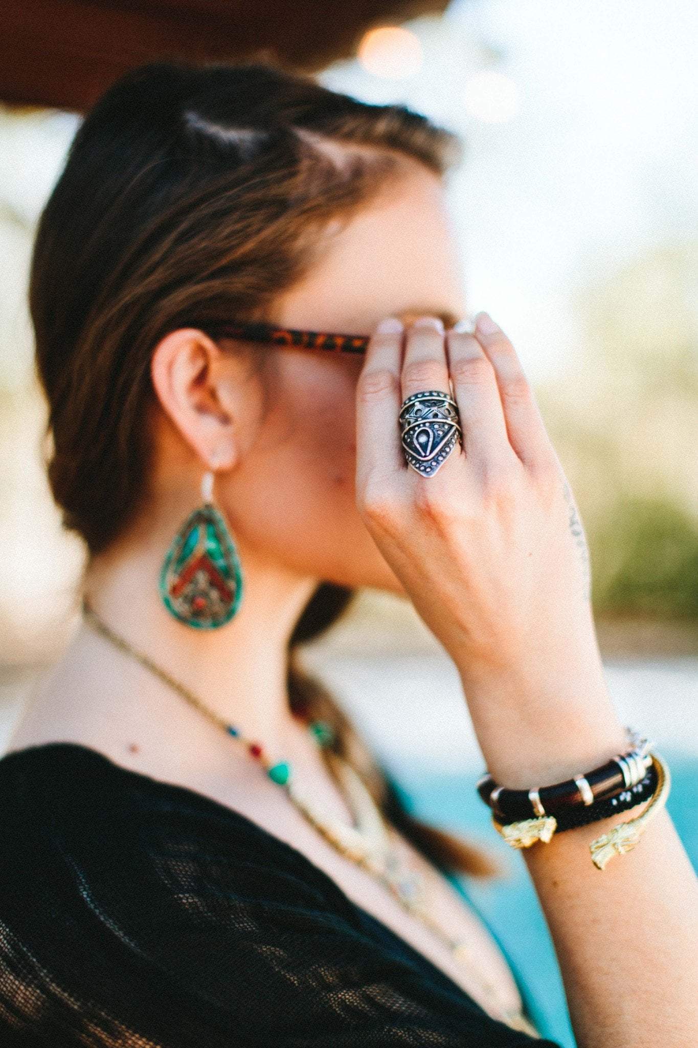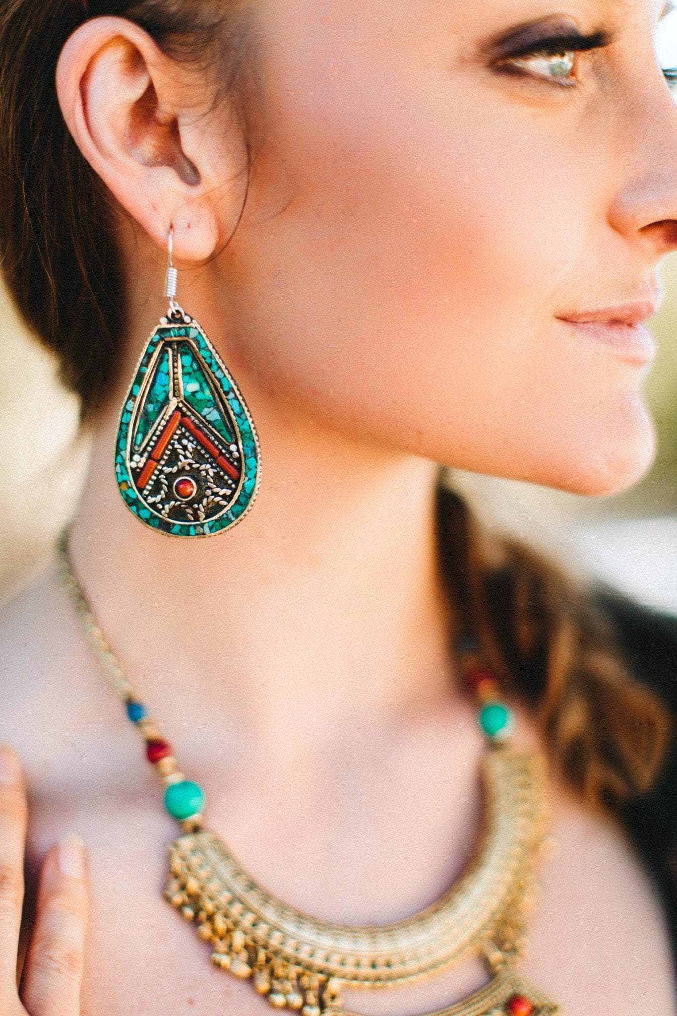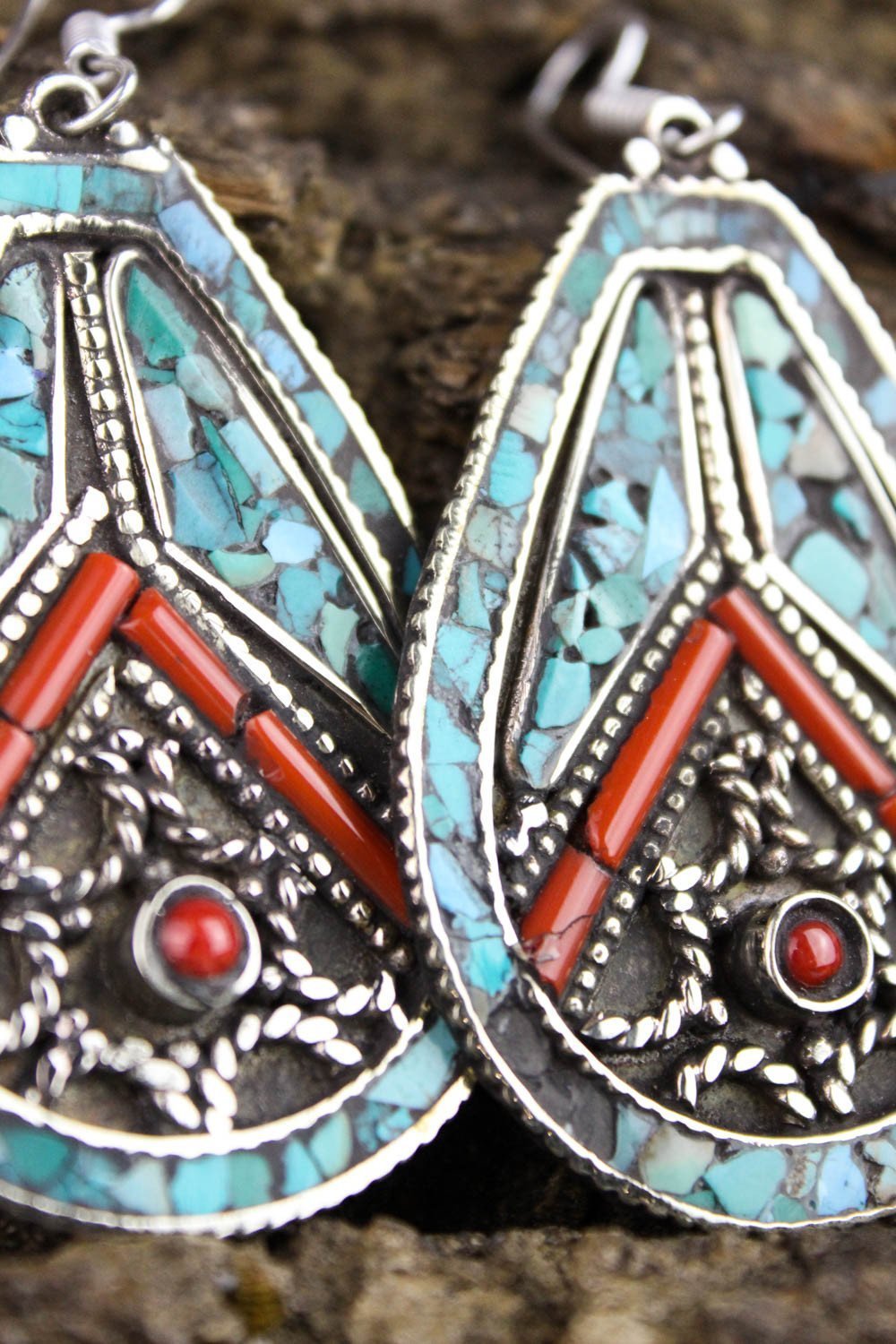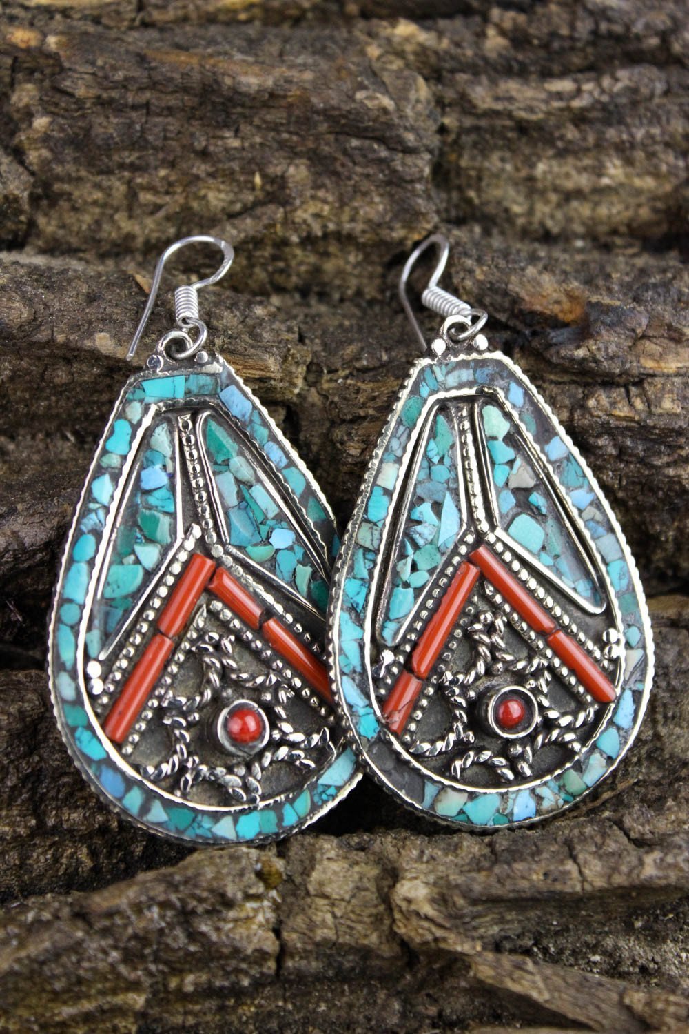 Los pendientes grandes siempre están de moda en la cultura tibetana. Estos aretes son de latón plateado con incrustaciones de turquesa y coral, con ganchos franceses plateados. Hecho a mano en Katmandú, Nepal.