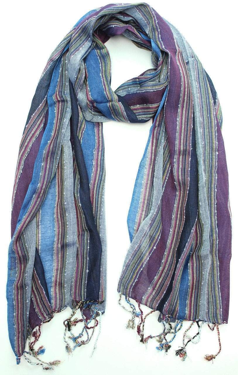 Azul y morado tejidos en una gran bufanda de algodón. De los extremos cuelgan borlas trenzadas y coloridas.