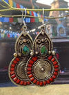 Coloridos y atrevidos, estos aretes están hechos a mano en Katmandú, Nepal, por nuestra artista joyera Karma Dolma. 1 1/4 pulgadas alrededor de latón plateado con incrustaciones de turquesa y coral, motivo de 2 peces.