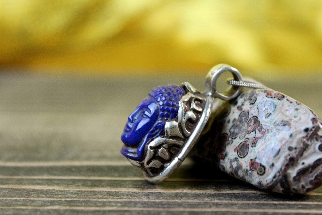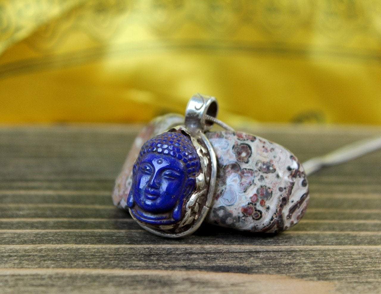 Buda de lapislázuli engastado en plata de primera ley con un acabado muy bonito. Flor tallada a mano en la espalda.