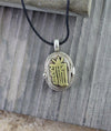 El símbolo kalichakra está engarzado en latón en la caja de oración de plata esterlina. Abre la parte trasera para encontrar una pequeña imagen del Dalai Lama y un trozo de un pañuelo de oración.