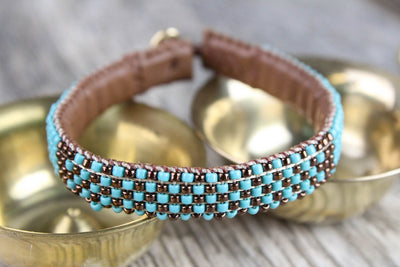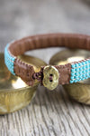 La pulsera de cuentas, sencilla y elegante, incluye hermosas cuentas de color turquesa y cobre con respaldo de cuero suave y cómodo. Un botón de latón y un cierre de presilla rematan la pieza. Queda genial tanto solo como con joyas adicionales.