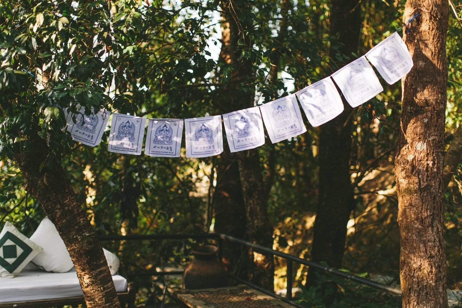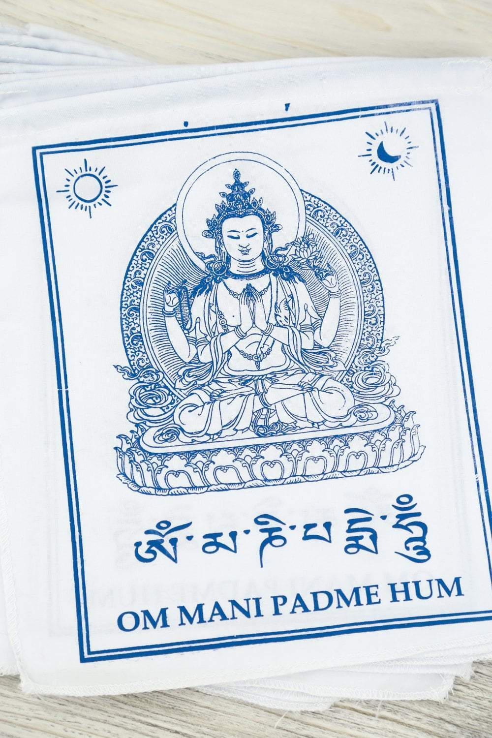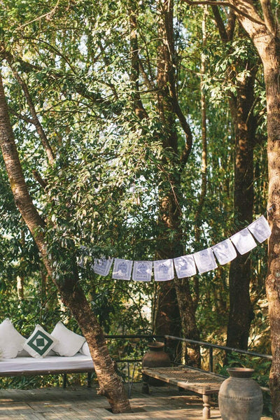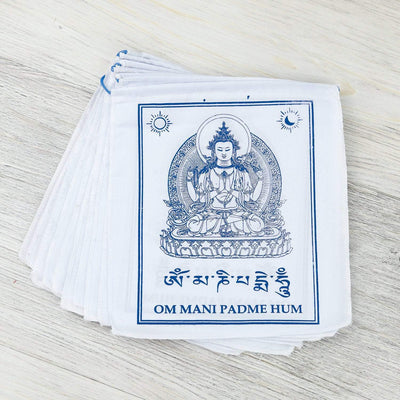 El juego incluye 10 banderas que miden aproximadamente 10 por 9 pulgadas. Toda la hebra mide aproximadamente 9 pies de largo. Confeccionado en algodón con dobladillo en Nepal.