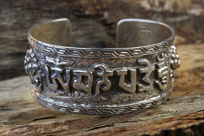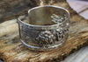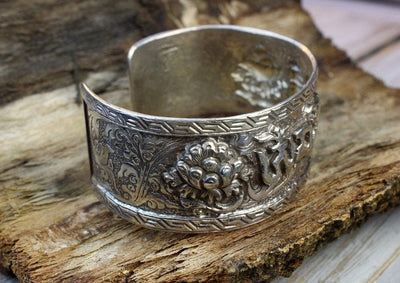 Brazalete Compassion Mantra de plata de ley tallada con flores de loto. Detalle fenomenal.