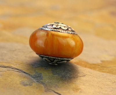 Esta gran cuenta tibetana sería una buena adición a cualquier mala, pulsera o collar. Copal ámbar con tapas de caracola.