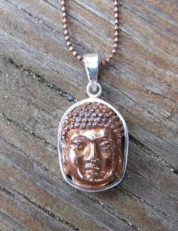 Esta pacífica cara de Buda está hecha en Tailandia y viene con una cadena de cobre de 18 pulgadas. Tamaño: 18 pulgadas de largo