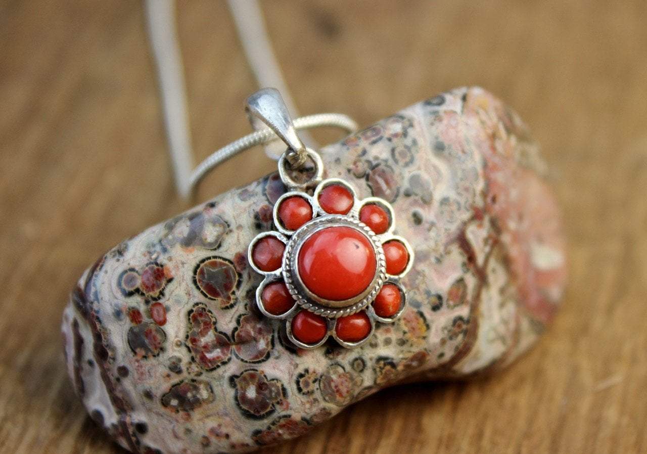 Colgante de piedra coral en forma de delicada flor. Las piedras de coral están engastadas en plata de primera ley. Hecho a mano en Nepal.