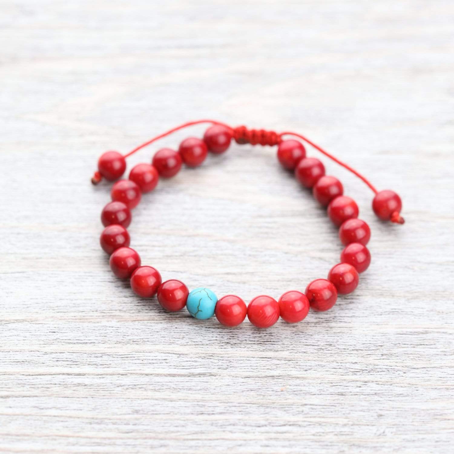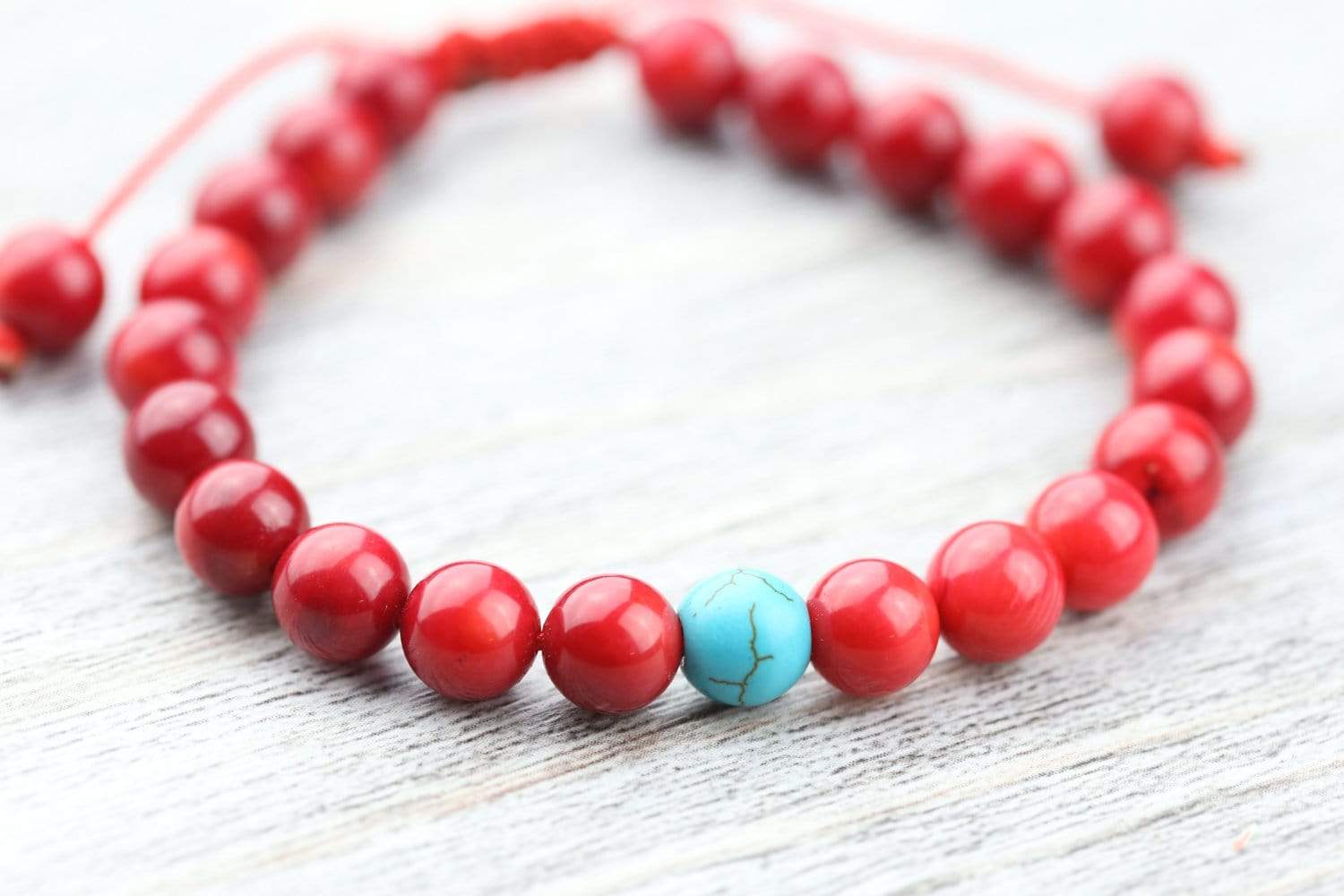 • Estas atrevidas y brillantes cuentas de coral de bambú están ensartadas con un espaciador de howlita de color turquesa que crea un accesorio simple pero colorido.