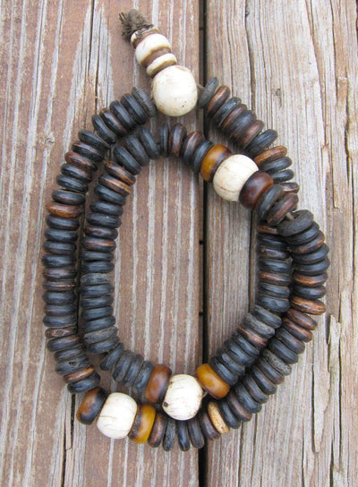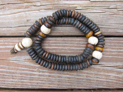 108 cuentas de disco de hueso de búfalo de agua teñidas de oscuro están espaciadas con 4 grandes cuentas de concha de naga de 15 mm y terminadas con una exclusiva cuenta de gurú de concha de naga. Encordado en Nepal con cordón de yute.