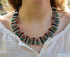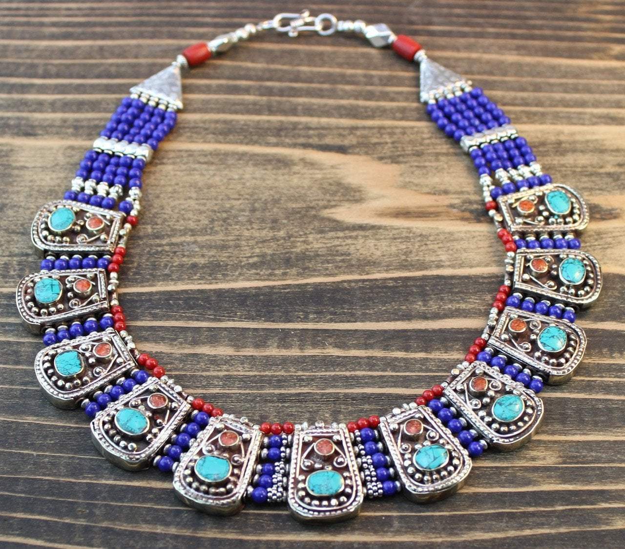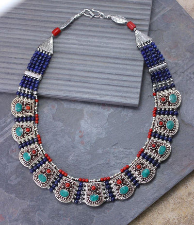 Este collar presenta hebras de cuentas de lapislázuli que conectan piezas tradicionales tibetanas con cuentas de coral y turquesa.