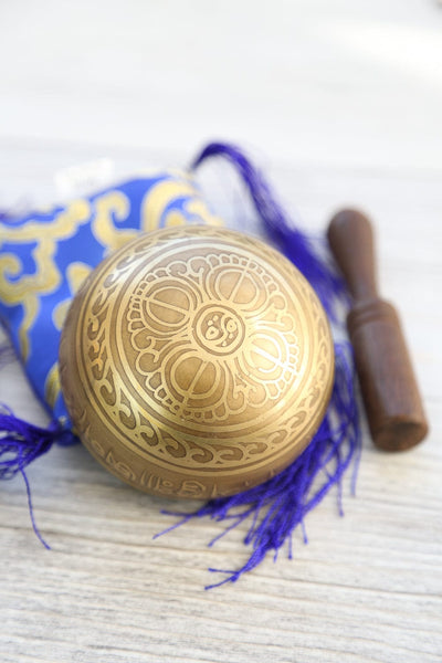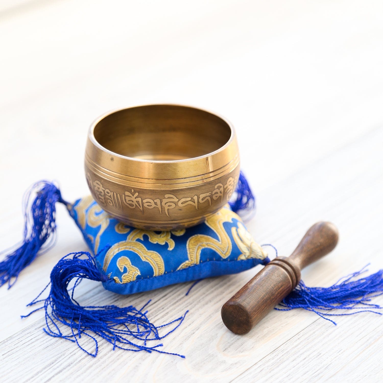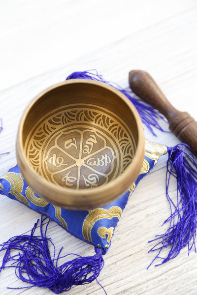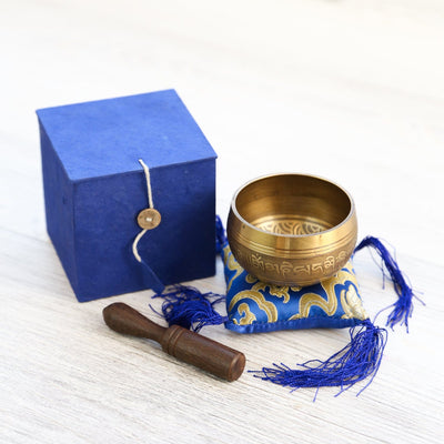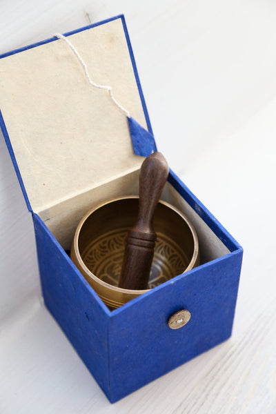 El cuenco de meditación está moldeado y afinado a mano con un diseño de mantra tallado por expertos artesanos en Katmandú, Nepal. La caja está hecha con papel lokta del Himalaya, cosechado de forma sostenible y sin árboles. El juego de regalo viene con un mazo de madera y un pequeño cojín tradicional para firmar.